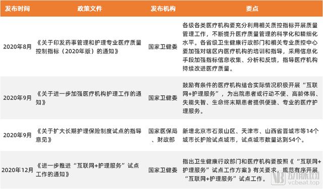 2020年,以國家衛(wèi)健委為主導(dǎo)的職能部門在一年內(nèi)的時間里共出臺了4項關(guān)于護(hù)理相關(guān)的政策,明確要求衛(wèi)生健康管理部門和醫(yī)療機構(gòu)加大護(hù)理工作力度,規(guī)范有序開展“互聯(lián)網(wǎng)+護(hù)理服務(wù)”試點工作。